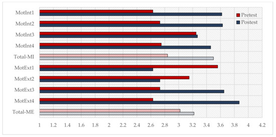 At the opposite extreme, the lowest average score in the intrinsic motivation of the pretest group was consigned in the variable related to the preference by the students toward the material that represents a challenge for learning new content. In the case of the post-test group, the variable with the lowest average score recorded is that related to student satisfaction after understanding the contents in an optimal way. Regarding extrinsic motivation, in the case of the pretest, the variable of the students with the lowest score is that of showing skills in the immediate environment, that is, among their family, friends, and teachers. On the other hand, in the post-test, it was the variable related to the students’ preference in obtaining a good class grade that obtained a lower score.