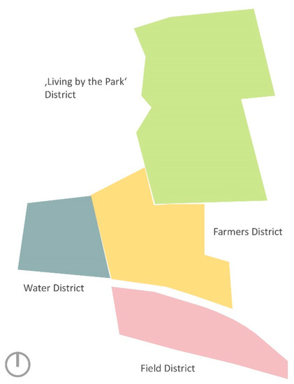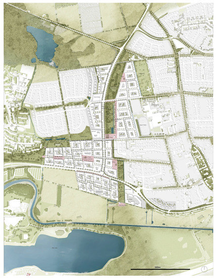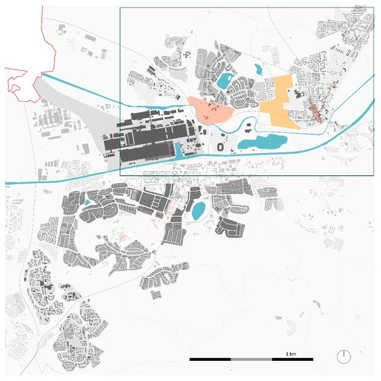 The most significant development of the city, which triggered the actual beginning of its sprawl character, took place between 1961 and 1998 (see also Figure 1). The further city growth intended to include a variety of building forms and social mix (but not a mixed use). This spatial and architectural experiment was designed as self-concentrated satellites, composed with no surrounding attachment. In this island-like urban structure the individual settlements were integrated into the urban landscape independently of one another over the course of time (eventually also in the northern part of the city). The patchwork-like building tissue seemed to have been created in an unplanned way and competed with the open space structures. The most significant characteristic of that design was the spatial separation of functions between “working”, “living”, and “leisure”. An attempt was made to gradually reflect the proportional relationships between buildings and the green and traffic areas, also between the density and insolation in each district [61]. The northern part of the city, which had not been included in spatial strategies of the city for decades, has recently gained new island-like settlements. They have been organized around the historical parts of the city—the castle of Alt-Wolfsburg and the core of Vorsfelde district (further described as a “Historical Axis”). Due to the fact that this is the youngest and dynamically growing part of the city, it has an enormous potential for changing its sprawling character, starting with the study area and further on spreading on the city as a whole. Therefore, the preconceptual proposal will focus on the creation of a compact built-up area, using the tools of Intelligent and Ecological Urbanism.