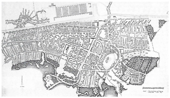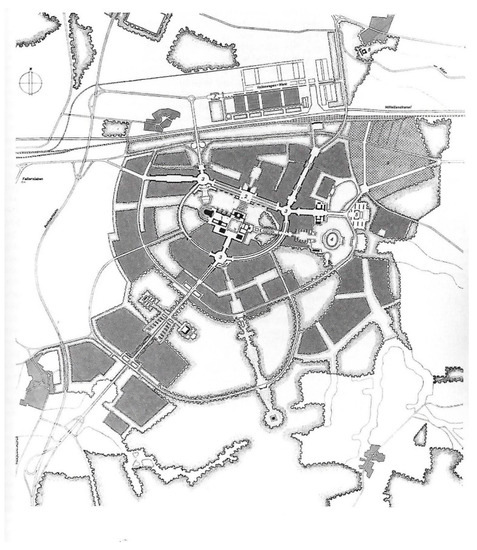 The city of the Volkswagen car, concept plan of an ‘industrial city as a garden city’ aimed at the north–south direction of the city’s development, draft by Peter Koller, 1938, [62] (p. 43).