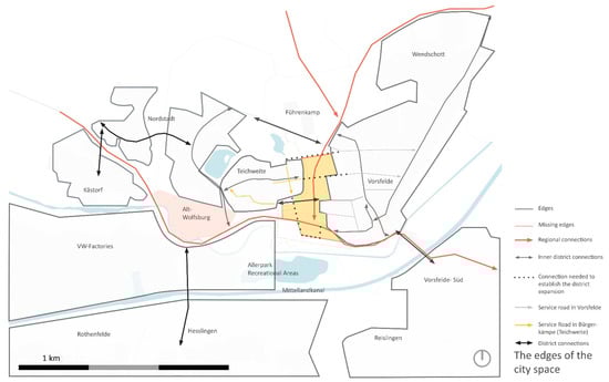 The cityscape was strongly influenced by the cultural landscape (Figure 9). The historical development of the northern part still shows the old connection between Alt-Wolfsburg and Vorsfelde and results in the “Historical Axis”, which is also linked to the course of the Aller. In order to create the coherence of the northern part of the city, it is necessary to bridge the development gap (design area) along this axis and to give this area a clear identity. This would result in getting a compact settlement structure in the overall picture.