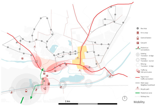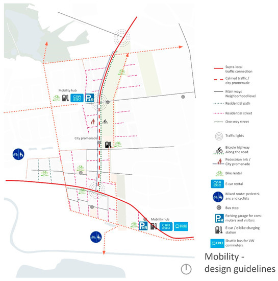 Mobility concept for the study area is based on the two mobility hubs located in the eastern and northern part of the study area. Their aim is to collect the commuters before entering the city area. The mobility should be strengthened with the pedestrian zones and cycling paths. Diagram, without a scale. Own elaboration based on the digital ALKIS Stadtgrundkarte (2018) of the city of Wolfsburg.