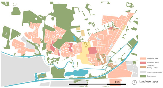 The land use types of the northern part of the city shows a homogeneous structure of the built and unbuilt spaces. It functions mainly as a “bedroom city” with a significant proportion of residential areas. The schooling facilities with sports areas, as well as educational centers that are spread across the residential islands, are intended for the youngest residents. The main landmark in the northern urbanscape is the VW plant—the city’s main area of commerce and industry, located in the western part. Other industrial areas are linked to the canal in the south. A belt of forests and dense parks, which seems to share the urban tissue with built-up areas, plays an equally important role. A single shopping street is found in the center of Vorsfelde (Figure 6).