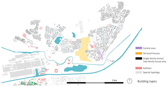 The western side of the district was created after 1950 and is typologically represented by attached and detached houses. This district is embedded in greenery and has a high proportion of open space structures (private gardens, community green). The settlement area of Vorsfelde is marked by mixed building types. The areas of single/multi-family houses, attached houses, as well as special typologies, e.g., knitted out by so-called carpet houses can be found here (Figure 7).