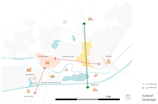 Cultural landscape of Wolfsburg. The “Historical Axis” connects the Alt-Wolfsburg with Vorsfelde, the “Culture-Recreational Axis” connects the Alt-Wolfsburg and Porsche Street, and the “Green Axis” is to be strengthened. Own elaboration based on the digital ALKIS Stadtgrundkarte (2018) of the city of Wolfsburg.