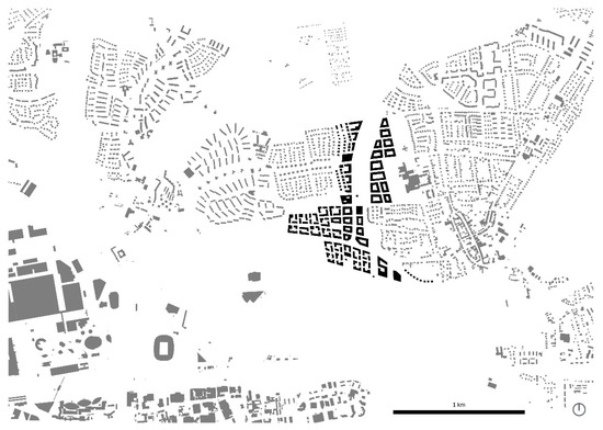 Similarly, the conditioning of the sustainable growth of the urban areas was recognized as one of the elements of the individual cultural and landscape values along with the respect for the tradition of the place [26,31,32,33]. It was considered as the basic element indicating the direction of the development of the new spatial order. This principle was implemented by highlighting Wolfsburg’s historical axes or the urban scale of the newly designed neighborhoods.