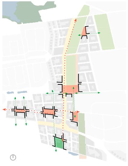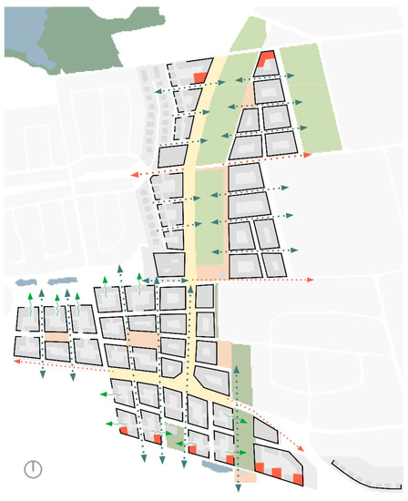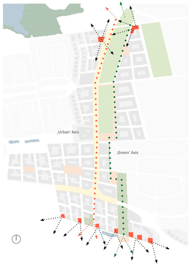 The overarching green corridor is reformulated with several open space types and offers a sequence of open spaces for the use of residents and guests. The area entrance is emphasized by selective high-rise buildings in the north and south and, thus, creates an opening to the landscape. The new district is orientated and linked to two differently formulated axes (Figure 11). The first, “Urban”, is seen as the city promenade and is directly connected with the outside area of the daycare center in the south. The parallel “Green” leads through the open space with a wealth of leisure activities and ends in the balcony area in the south. The link with the Wolfsburg city center in the south is indicated and, at the same time, the edge of the new district on the northern side of the river Aller is marked.