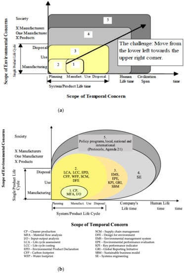 (a) Classification of environmental performance levels, [23] modified after [22]; (b) a classification of methods and tools for environmental performance improvements, modified after [23,25].