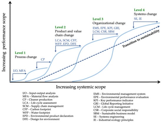 Each axis describes a change in scope. The horizontal axis shows the scope of systems and begins at the simple production process at Level 1. Furthermore, it extends to the set of processes within the value chain of a product at Level 2. Then, to the organizational level (Level 3), embracing concerns for production processes and products in addition to the integration of strategic management systems to implement sustainability consciousness in a more holistic manner. Within Level 3, aspects connected to economic and human factors should also be considered. The scope of the systems on Level 4 can be defined as the sector that the organization is a part of, or as wide as a societal system since all organizations are part of a larger system.