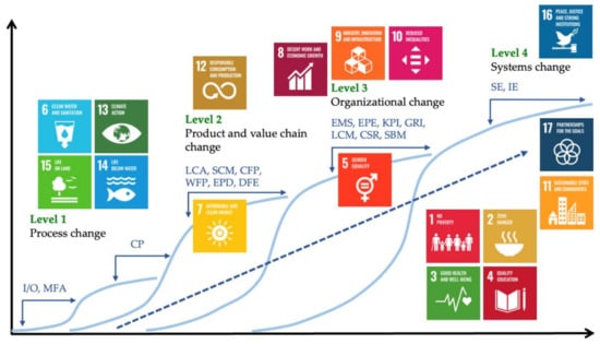 These challenges can be met by organizations with a combination of technological advancement and a change in procedures and strategies across different environmental performance levels that vary in temporal and environmental scope [22,23], for example: