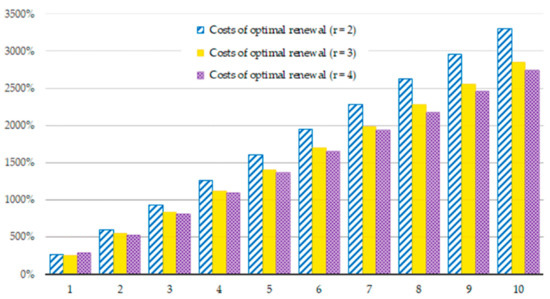 We conclude that a quick response—even after slight reduction of infrastructure’s availability level—and carrying out repair and corrective actions, making infrastructure return to the state of entire availability, is especially profitable in a longer exploitation time. From the conducted analysis, it follows that this trend is invariable, regardless of what percentage of cost of perfect renovation are the costs of partial renovation of the infrastructure. Table 3 presents results for the case when the cost of renewal to state 2 is 40% of the perfect repair cost and the cost of repair to state 3 amounts to 50% of the single perfect repair cost. At imperfect repair cost percentages of 50% and 40%, repairs of infrastructure after exceeding availability state 2 (for r = 2) are the most profitable in the period of 1 year of infrastructure exploitation. Over a longer period of infrastructure exploitation, starting repair and corrective actions after leaving state 4 of entire availability is the best solution to minimize the cost of an infrastructure’s renewals and maintenance. In other cases, considered in Section 5.2, the results are almost identical with those presented in Table 2.