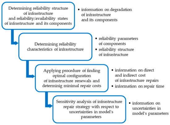With reference to the procedure of determining the optimal repair configuration that minimizes repair and exploitation cost within a certain time frame, as proposed in the article, conducting periodical system state inspections can be additionally taken into account. The inspections allow verifying the system’s estimated state and its time to failure (more generally—time of system departure from particular states), and accuracy of the proposed repair-conducting procedure. Afterwards, by verifying values of model input parameters, the procedure determining the optimal repair configuration of infrastructure is conducted again. Such a proceeding proposal, taking into account conducting sensitivity analysis of infrastructure repair strategy and management with respect to uncertainties in model parameters, is briefly introduced by the scheme in Figure 6.