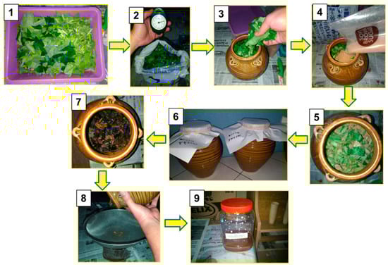 Steps in producing the fermented plant juice: (1) plant parts cut into pieces; (2) 1 kg of plant parts weighed; (3) plant parts placed into a clay jar; (4) 1 kg of brown sugar added; (5) all components mixed well; (6) covered and sealed jars left to ferment for 7 days; (7) fermented mixture of plant parts and brown sugar after 7 days; (8) fermented mixture filtered to separate sludge from the juice; (9) 1 L of the fermented plant juice placed in a container.
