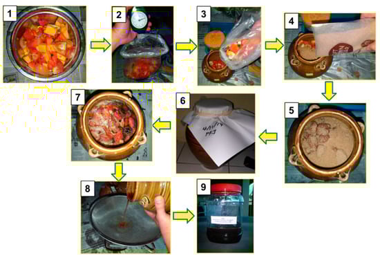 Steps in producing the fermented fruit juice: (1) fruits cut into pieces; (2) 1 kg of cut fruits weighed; (3) cut fruits placed into a clay jar; (4) 1 kg of brown sugar added; (5) all components mixed well; (6) covered and sealed jars left to ferment for 7 days; (7) fermented mixture of cut fruits and brown sugar after 7 days; (8) fermented mixture filtered to separate sludge from the juice; (9) 1 L of the fermented fruit juice placed in a container.