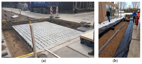 Examples of permeable systems that were full-scale tested at the Urban Living Lab Green Village TU, Delft, the Netherlands: (a) Bufferblock system, (b) Urban Rainshell.