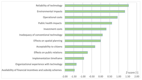 The results also provide insights into which of the four receptivity attributes was considered to require most priority. The majority (4/5) of the “Association” factors were considered priority factors for improvement to facilitate the transition to transformative infrastructures. All “Application” factors, on the other hand, have a negative Z-score and were not considered a priority. “Awareness” and “Acquisition” were in between. Therefore, the results provide an indication that specifically the willingness of decision makers and their understanding of what benefits this technology might bring to them should be strengthened.