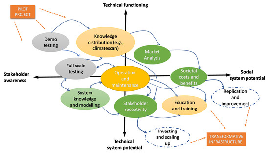 Overview of factors discussed in this article to move from pilot projects (left/top) to transformative infrastructure (right/bottom).