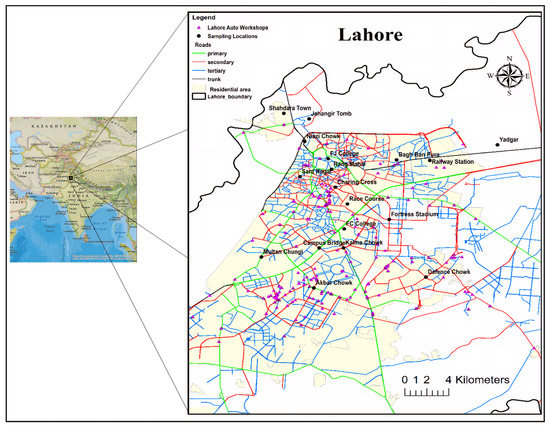 Lahore is the second largest city in Pakistan after Karachi and known as the capital of Punjab province. It has an area of 1772 km2 and population is 11.13 million based on 2017 census [9]. Lahore is at 74°19′45.75″ longitude, 31°34′55.36″ latitude, at an elevation of 217 m above sea level with a semi-arid climate and yearly precipitation of 628.8 mm. The average humidity is 39.8% and the main wind direction is north. The lowest and highest temperature in the city is between 19.8 and 40.4 °C with a yearly average of 30.16 °C [15]. The country’s oldest and longest road known as Grand Trunk (GT) road passes through the city, considered a source of pollution and causing higher levels of air pollutants throughout the year. The study area and sampling locations are shown (Figure 1).