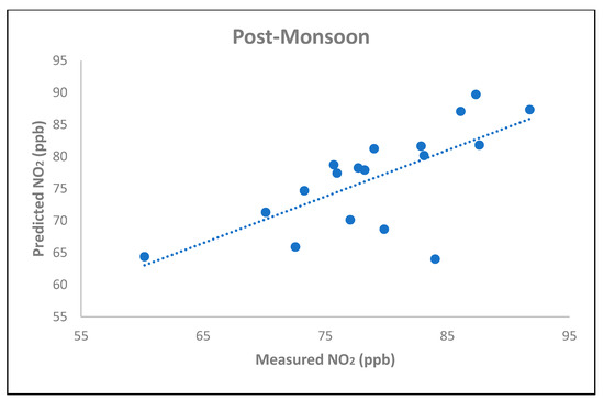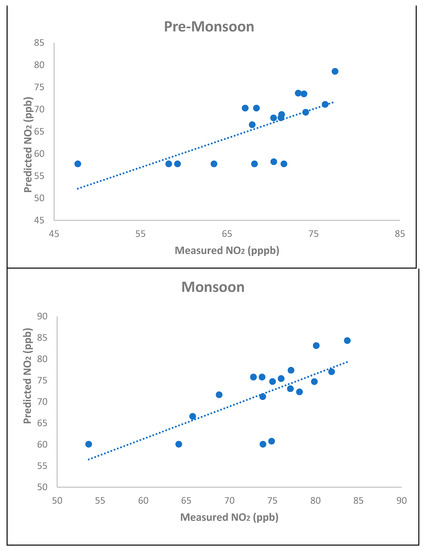 Scatter plots showing the measured vs. predicted values of NO2 (pre-monsoon, monsoon and post-monsoon).