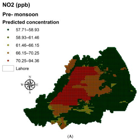 The maps of seasonal variation of predicted NO2 were done using 8172 uniformly distributed grids for the Lahore city (Figure 3A–C). Higher concentration was observed around the roads almost during all the seasons, indicating road traffic as a source of pollution while, lower concentration was seen around the sub-urban areas where the road network was not so strong, having open spaces and agricultural land (Figure S1).