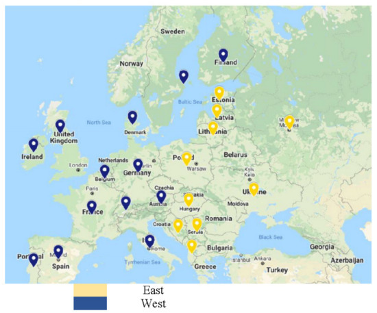 In the second stage of our research, an online survey was performed, with 10 questions based on the developed questionnaire. The invitation to participate in the study was sent to experts from various European regions. The data were collected through the Survey Monkey online survey tool (www.surveymonkey.com/, accessed on 20 April 2020). This web tool is widely used for survey studies because it offers a wide variety of question types, and at the same time it has a convenient interface [23]. The online questionnaire was used to present the statements with clear instructions to indicate the level of agreement or disagreement using a five-point scale where 1 was “strongly disagree”, 2 was “disagree”, 3 was neutral, 4 was “agree”, and 5 was “strongly agree”. Responses were divided accordingly between the analysed countries into the Eastern and Western European regions. It was done considering historical criteria and economic backgrounds as well as geographical location. The main idea was to understand whether economic developments and social-cultural values are influencing on ESM implementation and how this can be used to resolve the existing obstacles.