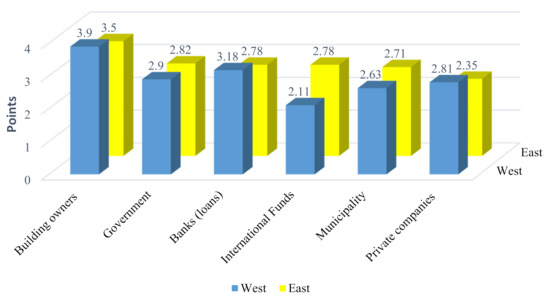 For the Eastern European countries, their governments, international funds, municipality, and bank loans are at the same level in terms of energy-saving measures (ESM) financing. One possible explanation for this is that Third Party Financing (TPF) is more common for larger investments (e.g., in case of ESM implemented by housing associations) where international agencies together with the government/municipalities have activated credit and reimbursement facilities to finance energy efficiency projects (e.g., the European Bank for Reconstruction and Development in Bulgaria, Ukraine) [23].