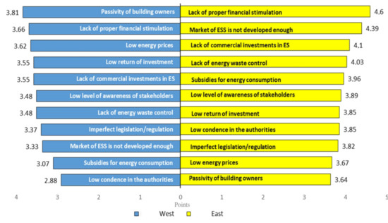 At the same time, some Eastern countries are still struggling to develop the market of ESS and to operate better energy waste control systems. There is also a need for the involvement of commercial investments in ESM. One of the reasons for low investment involvement is that in some Eastern European countries, selected groups of the population (e.g., retired, low-income families) pay discounted prices for heating. As long as subsidies for the energy prices are still driven by traditional concepts of social policy (e.g., Ukraine) this leads to a low return of the investments in ESM. The other obstacles that still hold back investment in some Eastern countries are the uncertainty in authorities and the imperfect legislation. It is likely that overall political and economic instability is strongly influencing the investors’ confidence in financing ESM [30]. Considering all the other unsolved problems, for Eastern countries passivity of building owners is the last reason that has an influence on energy-saving project implementation whereas for the group of Western countries this obstacle is the most important.