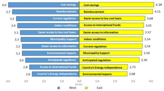 The main motivation factors for stakeholders appear to be very similar for Western and Eastern European countries (Figure 4). For instance, the cost savings and financial stimulations play the most important role for stakeholders across the regions. However, the Wilcoxon test again confirmed the statistically significant difference between the two samples with a level of significance α = 0.05. Namely, respondents from Eastern European countries gave slightly higher estimations for all motivation factors except for the environmental impacts (3.2 vs. 2.68). All financial motivation factors were identified by respondents of the group of Eastern European countries as the most important and put in the top of the list. It is obvious that for respondents from these countries, access to finance is more important (particularly, the easier access to low-cost loans and state support). Support through international funds was also identified as a strong motivational factor for this group and less than neutral for Western countries (3.61 vs. 2.8). The main explanation for this, as mentioned already in this paper, is that international agencies together with government/municipalities have activated credit and reimbursement facilities to finance the energy efficiency projects (e.g., the European Bank for Reconstruction and Development in Bulgaria, Ukraine).