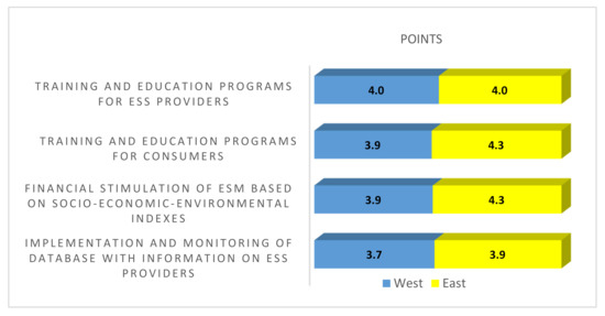 All respondents agreed that in order to increase the quality of energy-saving projects and to control the environmental impacts from the implemented measures, training and education programmes are needed (Figure 8). The only difference in answers is that according to the respondents from Western Europe, the training of (ESS) providers is more important than education programmes for consumers. That is not the case for respondents from Eastern countries, who believe that the most important approach is to teach stakeholders and then to implement a financial stimulation based on the socio-economic-environmental indexes. The implementation and monitoring of a database with information on ESS providers is considered the least important for both the Western and Eastern European regions.