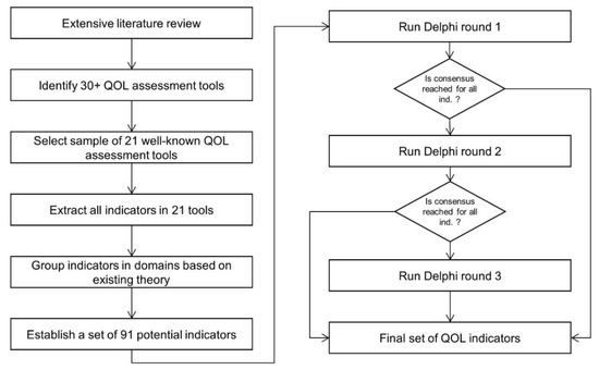 As shown in Figure 1, the research methodology used in this study is composed of two phases: first, using a structured procedure, a set of potential indicators is selected to be used as input for the Delphi procedure, then the Delphi procedure is conducted to select a final set of QOL indicators.