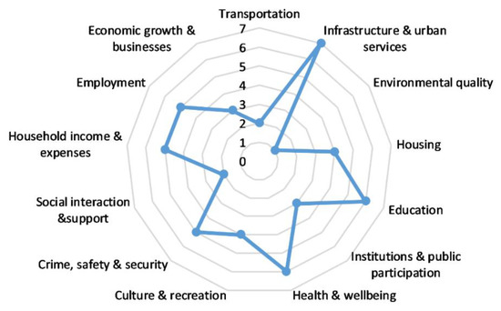 As shown in Table 2 and depicted in Figure 3, the number of indicators that rated as important ranged between one to seven indicators per domain. The “infrastructure and urban services” domain includes the highest number of indicators (7 out of 53 selected indicators), followed by “education” and “health & wellbeing” domains each of them includes six indicators, followed by “crime, safety and security”; “household income and expenses”; “employment” domains each of them has five indicators. The least number of indicators is found in the “environmental quality” domain which includes one indicator, followed by the “transportation” and “social interaction and support” each of them includes two indicators. These results can be explained by the conditions and particularities of the Saudi context. For example, the fact that the “environmental quality” domain has only one indicator reflects the fact that environmental issues are not getting enough attention yet in global south countries such as SA. On the other hand, the “social interaction and support” domain represent an important aspect/characteristic of conservative society such as the Saudi community, thus it is not representing a major concern/issue which may explain the selection of only two indicators to measure/assess this domain.