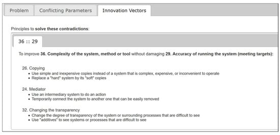 CSDT introduces a series of vectors of innovation for tackling the conflicts between various performance characteristics. They are generated by TRIZ-MC [], applied for solving contradictions between various performance characteristics. According to data in Figure 3, the order of tackling contradictions, given by the indicator K, is: (1) PC1 against PC4 (K = −1.62); (2) PC1 against PC2 (K = −1.29); (3) PC1 against PC3 (K = −1.01); (4) PC2 against PC4 (K = −0.6); (5) PC3 against PC4 (K = −0.47) (note: the sign “−” indicates the negative correlation, or contradiction). We use the software tool available at [] to reveal the vectors of innovation. They are presented in Table 2.