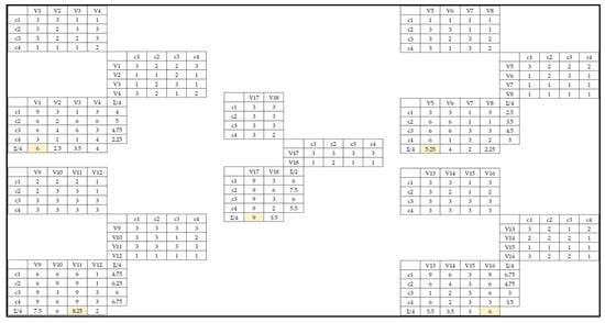 The application of the AIDA method for the list of vectors from Table 2 is shown in Figure 4. For each decision area, the AIDA method establishes the level of influence of each element from the row on each element from the column (1, 2, or 3). Then, the value from every box from matrix one is multiplied with the value from the corresponding box from matrix two and introduced in matrix three. The average of values on columns and rows is also introduced in matrix three. For example, in the case of vector V1 (see Figure 4, top left corner), values in the third matrix along the V1 column are: 9 = 3 × 3; 6 = 3 × 2; 6 = 3 × 2; 3 = 1 × 3, and 6 = sum (9, 6, 6, 3)/4. For each decision area, the vector with the highest average value is selected from the list of candidate vectors from Table 2 (see Figure 4). Table 3 shows the selected vectors of innovation for each decision area after the application of the AIDA method.