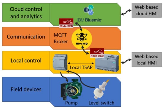 The local control unit has a Logo8! PLC manufactured by Siemens (Munich, Germany), which controls the two pumps and reads the status at the level of switches. An IOT2040 IoT gateway manufactured by Siemens is used to read or write data to the PLC by means of a communication protocol and exchange data with the cloud control platform [].