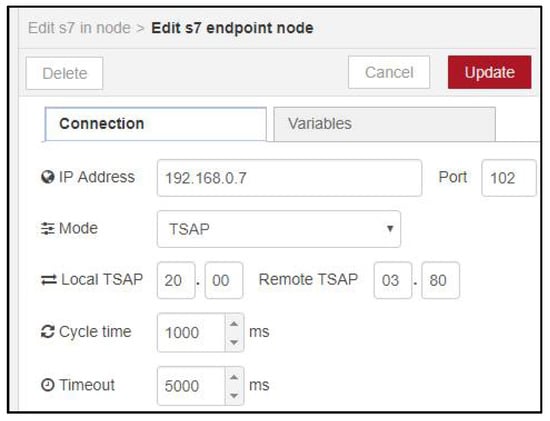 Using the TSAP communication protocol and the s7 in and s7 out node-RED functions, data are read or written from and to PLC by the IOT2040 gateway. To exchange data between the IOT2040 gateway and the cloud platform, the MQTT communication protocol is included in the SCADA architecture. On top of being an asynchronous communication protocol, MQTT has the advantage of having a lightweight data framework and does not require high computational resources [].