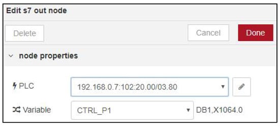 - NPM. Node–Red-Contrib-s7. Available online: https://www.npmjs.com/package/node-red-contrib-s7 (accessed on 11 May 2020).