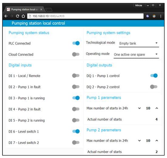 In a more advanced application, the HMI that runs in the cloud must have several sections, one for every remote-controlled automation system. Since the testbench has only one remote automation unit, the HMI that runs in the cloud is able to provide monitoring and controlling functions related to the pumping station. Therefore, the interface is similar to the one that runs locally on the IOT2040 gateway (see Figure 5 and Figure 11).