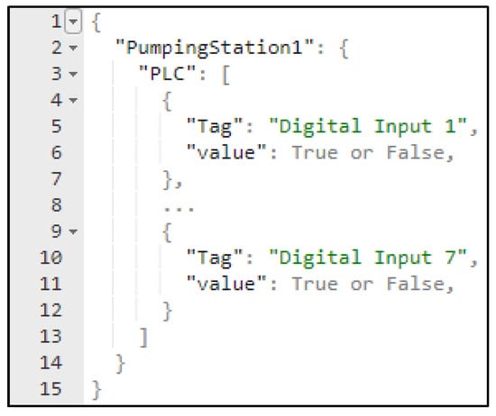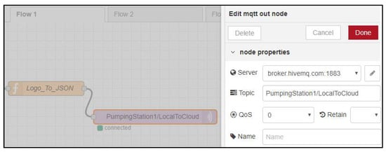 Figure 12 presents the configuration of MQTT out function in the node-RED programming environment that runs on the IOT2040 gateway. The node-RED application that runs on the IOT2040 gateway publishes data under the topic PumpingStation1/LocalToCloud with a JSON structure, where data representation is described (see Figure 13).