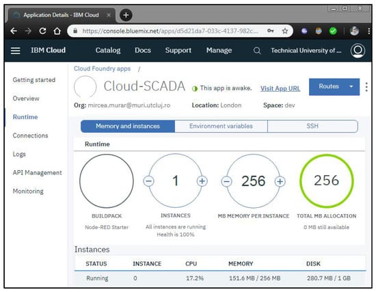 The IBM Bluemix (IBM Cloud) cloud computing platform was considered as the development and running environment of the remote monitoring and control application for the testbench. Registration for a lite account provides access to a specific runtime and storage memory in the cloud and free data exchange with real-world devices up to a bandwidth limit is ensured []. For a real WWT plant, a professional account must be registered for an affordable annual fee; thus, being offered adequate resources in the cloud. The result of the configuration process is seen in Figure 14.