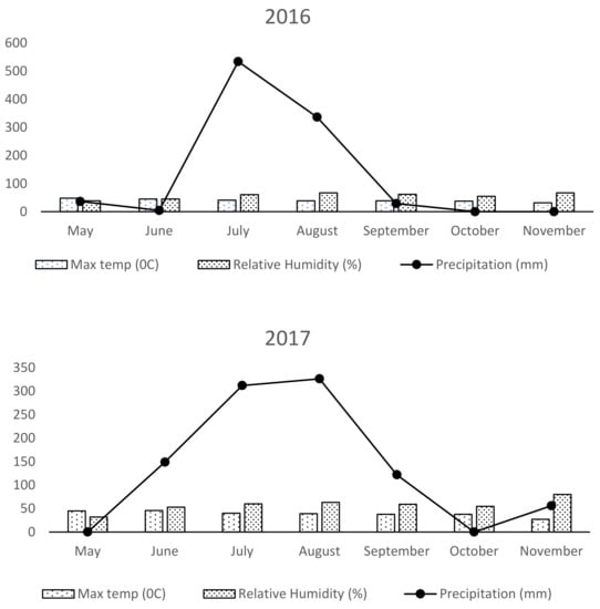 Climatic variations during the growing periods for the years 2016 and 2017.