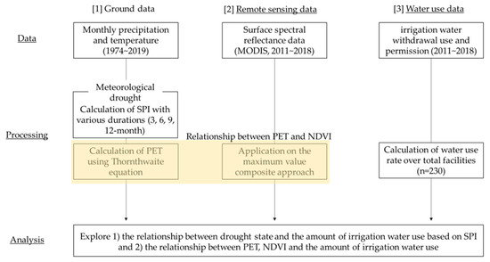 First, a wide range of SPI are calculated using the cumulative precipitation series in consecutive periods of 3-, 6-, 9-, and 12-month. The PET, which is highly correlated with agricultural drought, are calculated using Thornthwaite method [18]. NDVI, which is well-known as an agricultural drought assessment index, are calculated using the remote sensing data. Irrigation water withdrawal from the river is adopted for water use rate (WUR) data. This study then explores the relationship between SPI, PET, NDVI and WUR (Figure 1).