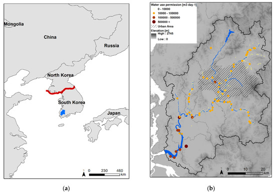 Yeongsan river basin located in southwestern of the South Korea; (a) the Yeongsan river basin of South Korea; (b) Streamflow withdrawal permit for irrigation water use in the Yeongsan river basin.