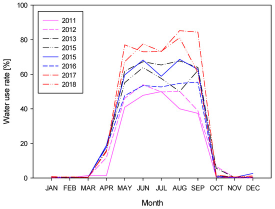The irrigation water for rice paddy is mainly supplied from streamflow withdrawal facilities. Starting with the farming season, streamflow withdrawal begins in April, and the WUR becomes the highest in June, and then the WUR drops in September and becomes nearly zero in October (Figure 3). By comparing inter-annual variability of the WUR, it was observed that the highest WUR was in 2017. The year 2017 was a dry year given that the amount of total precipitation (903.6 mm) was about two third compared to the annual mean precipitation (Figure 4). It implies that less precipitation may cause higher WUR to compensate for the lack of surface run-off into the agricultural land.