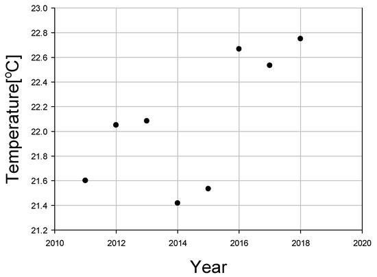 There was an increasing trend in irrigation water use rate. Although the record length is short, Figure 4 shows the change in average temperature from April to September. There are strongly increasing trends. The increase in temperature led to an increase in evapotranspiration and a decrease in soil moisture. Therefore, recently there was increasing in irrigation water use.