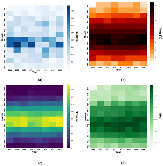 Monthly precipitation, temperature, PET and NDVI in 2011–2018 in study area. (a) Precipitation; (b) Mean temperature; (c) PET; (d) NDVI.