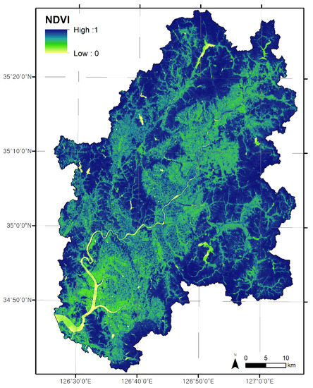 In this study, the surface spectral reflectance data, acquired by Moderate Resolution Imaging Spectroradiometer (MODIS) equipped on Terra satellite, were used to calculate NDVI for the study area. The various types of the Terra/MODIS data are freely available through the Land Processes Distributed Archive Center (LP DAAC) within NASA Earth Observing System Data and Information System (EOSDIS) [21]. In this study, the atmospherically corrected surface reflectance data acquired within the 8-day composite period, which is called MOD09A1 product, were employed to calculate the spatial distribution of NDVI for 8 years (2011–2018). The NDVI distributions for 8-day intervals, were processed as the monthly NDVI distribution using the maximum value composite (MVC) approach [22]. Figure 6 shows the spatial distribution of averaged NDVI. In summer (from June to August), the values of NDVI higher than 0.5 account for 87.8% of this study area while it tended to decrease as 11.3% in winter (from December to February). The monthly variation of NDVI were a quite large in South Korea. It generally began to increase from April and reached the highest in August (Figure 5d).