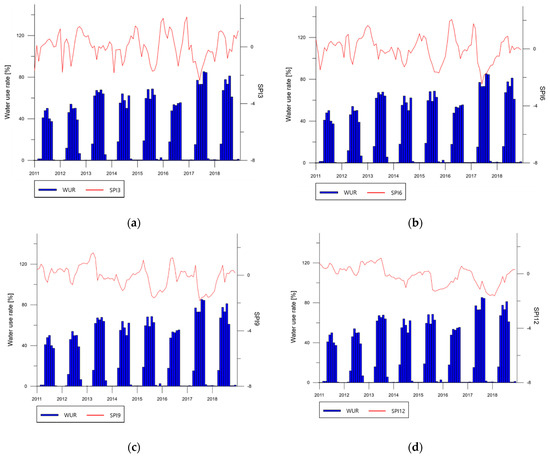 SPI (SPI < 0) and irrigation water use rate (WUR) from May to September. (a) 3-month; (b) 6-month; (c) 9-month; (d) 12-month.