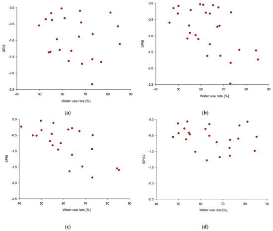 As shown in Figure 9, it seems that there is a negative correlation between the WUR and drought conditions indicated by SPI6 to SPI9. In particular, the highest correlation was shown in SPI9, the least correlation was shown in SPI12 (Table 2). Generally, the drought is relieved by passing wet summer season (June to August under strong seasonality with temperate climate), thus, drought rarely last longer than a year in Korean Peninsula. As mentioned above, the relationship between the severe drought and the WUR was demonstrated, and it was found that longer accumulative duration shows stronger relationship with the WUR unless it persists longer than a year.