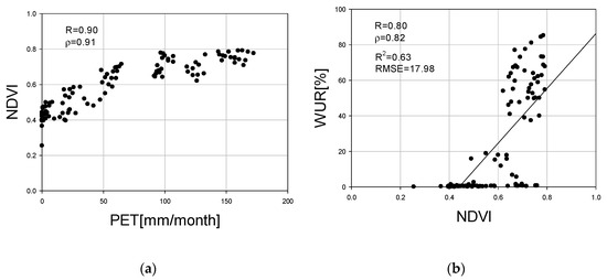 Figure 11a shows the relationship between PET and NDVI in this study. As discussed above, the correlations between two variables were statistically significant as the correlation coefficients were over 0.9 (p-value < 0.05) for both Spearman and Pearson correlation analyses. Based on the results of correlation analyses, the feasibility of the use of NDVI for quantitative prediction of the WUR was also investigated as shown in Figure 11b. The NDVI was also highly correlated to the WUR with the correlation coefficients over 0.8 (p-value < 0.05) for both Spearman and Pearson correlation. The linear regression model constructed by OLS method yielded the prediction results with 0.63 of R2 and 17.98 of RMSE. The performance of the linear regression model was relatively inaccurate than the regression model using PET. Despite that, this approach based on the satellite data could be attractive to couple with various meteorological and hydrological data.