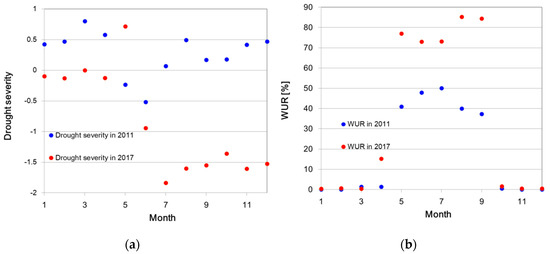 WUR relative to SPI from April to September in 2011 and 2017. (a) SPI; (b) WUR.
