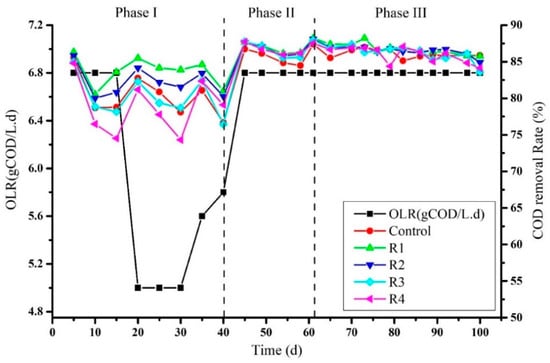 The sludge used in this experiment was taken from the previous experiment of co-digestion of molasses and rice alcohol wastewater. The experiment was started initially at organic loading rate 6.8 g COD/L of molasses. After 5 days of the experiment, the average COD removal rate of control, R1, R2, R3, and R4 was recorded as 85.575%, 86.33%, 85.84%, 85.01%, and 84.8%, respectively (Figure 1). While feeding the reactors with the same OLR, a decrease in COD removal rate at day 15 was observed and recorded as 78.77%, 83.59%, 80.80%, 78.17%, and 74.52% in control, R1, R2, R3, and R4, correspondingly. Due to this reason, feeding to the reactors was stopped for 3 days. After this break, the organic loading rate was lowered to 5 g of COD L−1·d−1. An increase in percentage of the COD removal rate was observed on day 20 in control, R1, R2, R3, and R4 and recorded as 82.75, 85.84, 84.15, 82.29, and 81.19, respectively. However, on day 31 of the experiment, the organic loading rate was increased to 5.6 g COD L−1·d−1, and different concentrations of nickel solutions 2, 4, 8, and 16 mg/L were added to R1, R2, R3, R4, respectively, leaving the control. The COD removal rate at day 35 after the addition of nickel that was observed ranged 81.08%, 84.60%, 83.41%, 82.42%, and 82.33% in control, R1, R2, R3, and R4. Again, a decrease in the COD removal rate was observed on the fortieth day due to decreased pH. This increase and decrease in COD removal rate might have been due to sludge inactivation from the last experiment. Another reason could be the mono-digestion of molasses that could suppress the microbial community. On the other hand, no such effects of Ni have been detected on the digestion process’s stability. Colussi et al. (2009) reported variation in COD removal rate between 95% to 76% upon the addition of nickel [25]. Nickel was also reported to promote acidogenesis immediately rather than methanogenesis, and hence encourage the production of VFAs. On the other hand, bio-granules in the methanogenic phase were highly sensitive to metals rather than the acidogenic phase [26].